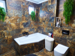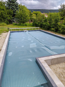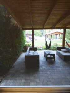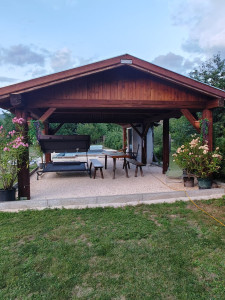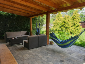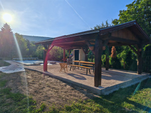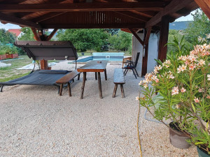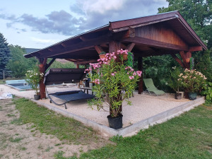 A hátsó kert 2 fedett terasszal rendelkezik valamint itt található egy kerti grillező is az épített medence mellett, ahol a nyári melegben minden nap kedvünkre élvezhetjük a fürdőzést. A medencében a víz mélysége 140 cm, hossza 6 m, szélessége 4m.