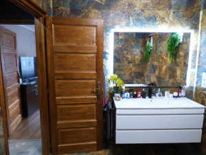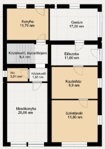A bejárati ajtón belépve a földszinten találunk egy tágas előszobát, innen nyílik a mosókonyha, egy mosdó helyiség, a kazánház, ahol gázkazán és vegyes tüzelésű kazán biztosítja a téli hónapokban a meleget.