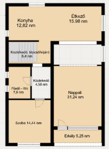 Az előszobától jobbra egy konyha helyezkedik el, innen ki tudunk menni a 35 nm-es fedett teraszra.