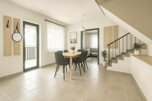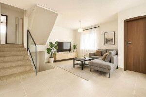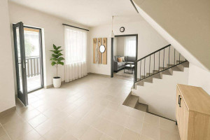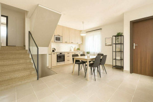 A felső szint közel 91 nm-es, lakótere tágas, világos szobákat, nagy nappalit és fedett teraszt foglal magában, míg az alsó szinten konyha–étkező, fürdő, kamra, a nagy méretű garázs és a funkcionális pince–gépház található.
