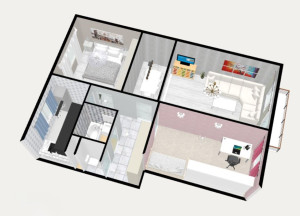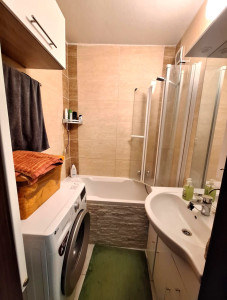 Az eladó lakásban három külön nyíló szoba található (a nappalival+hallal együtt), konyha, fürdőszoba, valamint külön mellékhelyiség. A fürdőszobában modern járólap burkolat mellett fürdőkád került beépítésre, amelyre egy elhúzható, üveges kabinrész is felszerelésre került, így kényelmesen használható zuhanyzásra is, anélkül, hogy kifolyna a víz.