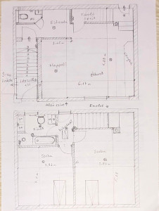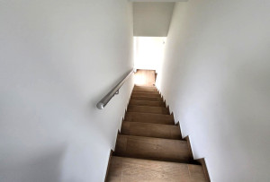 A földszinten egy kényelmes előszoba, egy modern bidet-wc kézmosóval, valamint a lépcső alatt kialakított praktikus tároló található, amely a 30 nm-es nappali–konyha–étkezőből nyílik. A nappali szilárd tüzelésre alkalmas kéménnyel rendelkezik, és innen néhány lépcsőfokon keresztül juthatunk ki a hátsó kertbe.